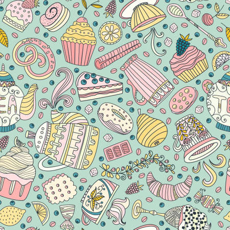 お菓子やデザートにかわいいシームレス パターン ケーキ アイスクリーム ティーポット 落書きスタイル ベクトル 焼かれた商品 レストランのメニューのティー パーティーの背景 のイラスト素材 ベクタ Image